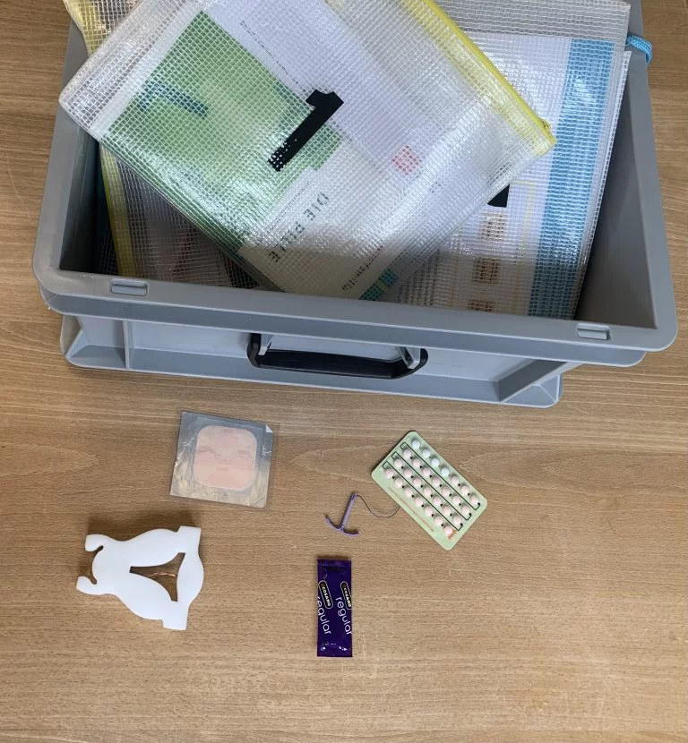 Nebst verschiedensten Verhütungsmitteln finden sich im Koffer Unterlagen und Broschüren.