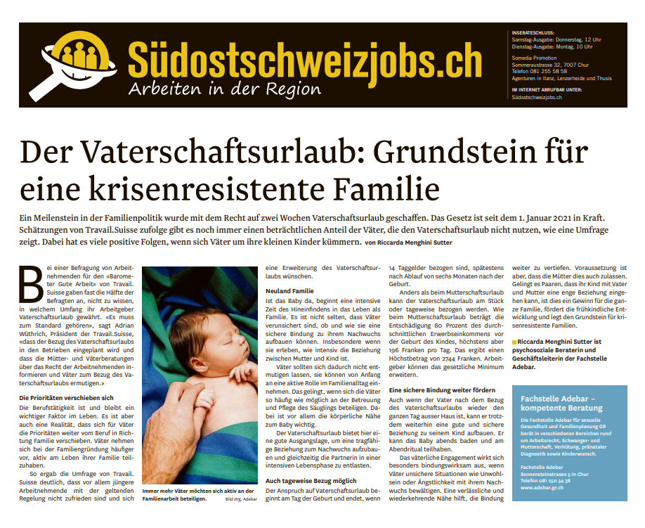 Riccarda Menghini Sutter zeigt in ihrem Artikel in der Südostschweiz auf, dass immer noch ein beträchtlicher Anteil der Väter den Vaterschaftsurlaub nicht nutzen, obwohl es viele positive Folgen hat, wenn sich Väter um ihre kleinen Kinder kümmern.